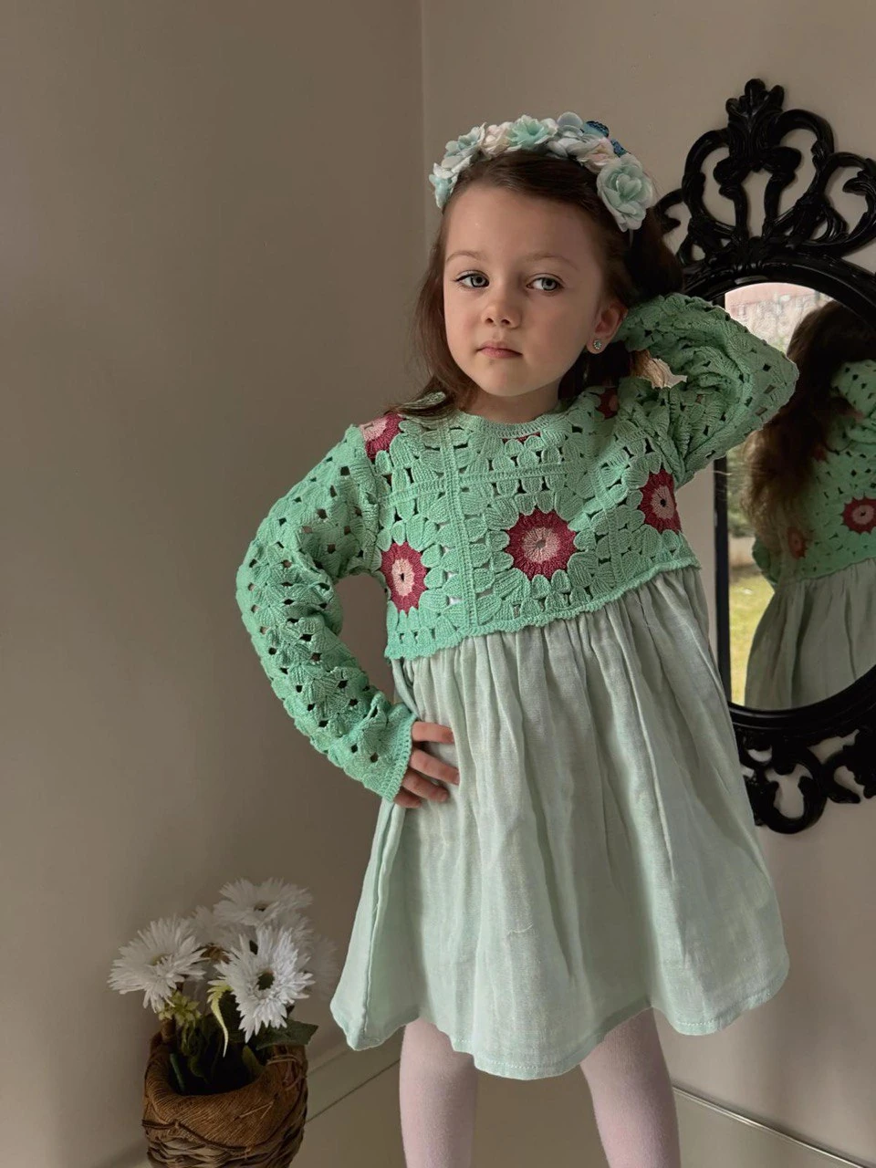 Üst Kısmı Dantel Örgü Kız Çocuk Elbise